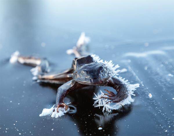 只要气温降到摄氏零度以下,在10分钟之内,木蛙的皮肤下面就开始结冰;3小时后,动脉和静脉血管冰冻,心脏和大脑停止运作;24小时之内,木蛙身体的65%都冻住了。从外观看来,此时的木蛙就像一块有颜色的冰坨。但如果气温回升,木蛙可以逐渐解冻,心脏和大脑恢复功能,身体的其他部分也丝毫未损。只需要几个小时,它就重新活蹦乱跳起来了。
