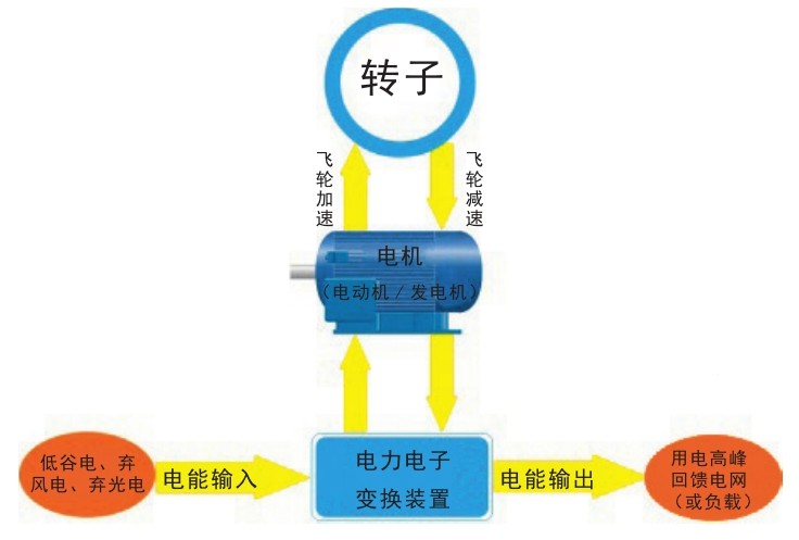 这里所说的“飞轮”,是指飞轮储能中的“飞轮”。它要比传统的“车轮”结构更复杂,技术含量也更高。飞轮储能也叫“飞轮电池”,其原理是利用高速旋转的飞轮所拥有的惯性来儲存能量。飞轮储能装置实际上是一套“电能—动能—电能”高效转换的技术系统,主要由转子系统、电机系统和电力电子装置三大部分构成。转子系统的作用就是储存能量,电机系统的作用就是进行能量转换,电力电子装置的作用就是提高飞轮储能系统的灵活性和可控性。