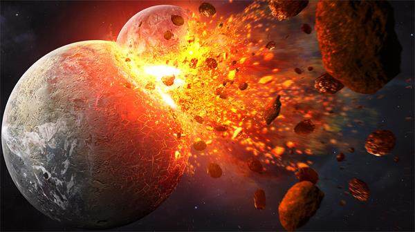 45亿年前的那颗原行星的大小和现在的火星差不多,由于周围天体的引力作用,它偶然脱离了原来的轨道和地球发生了碰撞,那次碰撞极其剧烈,足以使地球的相当一部分融化和气化。