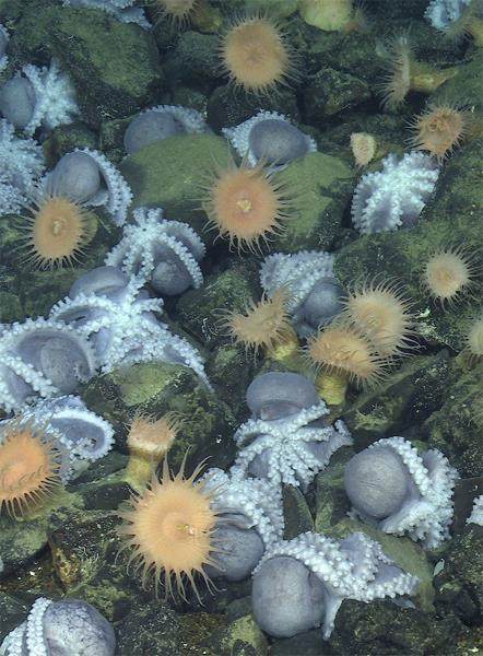 2018年,一个研究团队乘船前往美国加利福尼亚州中部海岸附近水域进行调查,计划将勘探范围从戴维森海山顶部扩大到周围的一些水下山丘。随着“E/V鹦鹉螺号”深海研究船缓缓下沉,来到海平面以下约3200米处,科学家们看见数千只章鱼在海床上蜷缩成单个的球状,如同一朵朵盛开的鲜花,排列得整整齐齐。