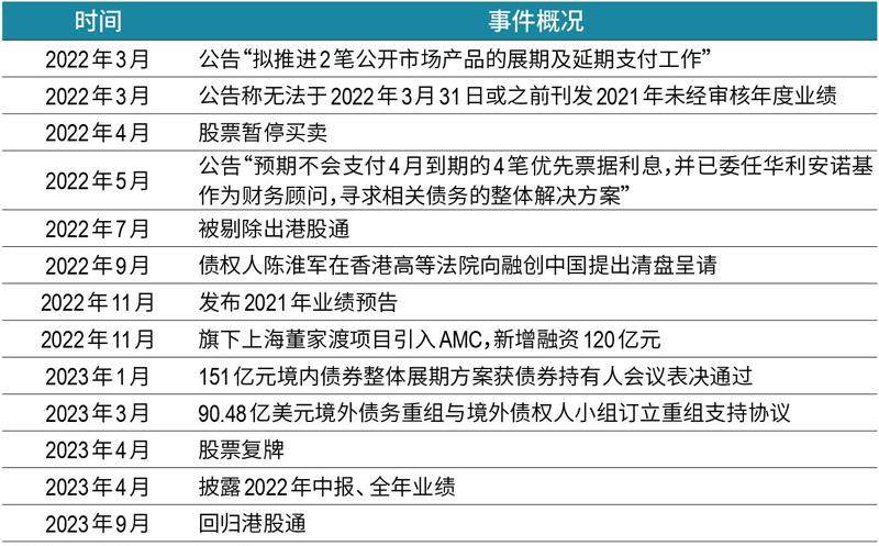 当时,其首次向外界公告债务违约,“面临阶段性的资金压力”“债券出现展期”。由于当月未能刊发年报,融创中国股票于4 月1 日开始停牌。2022 年7 月和9 月,其又相继被剔除出港股通、被投资者提出清盘呈请,跌落至谷底(表1)。