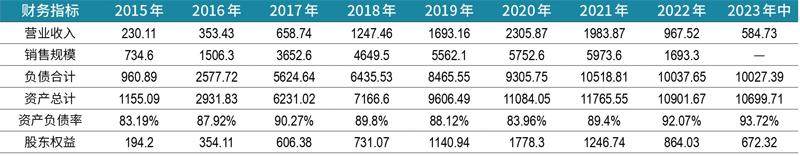 表2:2015—2023年融创中国的债务与销售规模变化(单位:亿元)