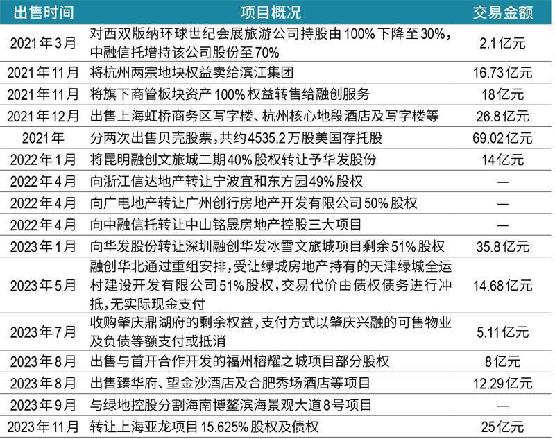 配股融资之外,为应对紧张的流动性,2021 年上半年,融创中国就开始频繁出售资产、退出联营合营项目,包括抛售西双版纳环球世纪会展旅游公司、上海虹桥商务区写字楼、昆明融创文旅城二期以及杭州核心地段酒店及写字楼等项目。此外,融创中国通过减持贝壳(BEKE.N)股份,且将旗下商管板块资产转售给融创服务,获得18亿元现金。