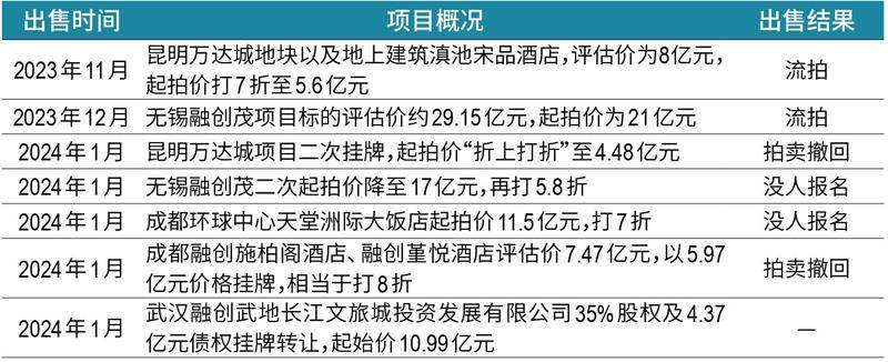 2023年,“进淄赶烤”“尔滨走红”频上热搜,文旅市场热度高涨,融创中国的打折力度也给得很足。不过,由于投资者总体仍比较谨慎,具备实力接盘的企业也不多,其中不乏资产流拍等情形(表5)。接下来,融创中国或抛售更多文旅资产,但套现难度可想而知。