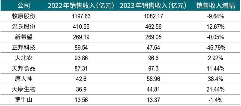 叠加上游玉米、豆柏等饲料原料价格持续高位,导致生猪饲养成本增加,成本端和消费端双面受冲击的猪企,销售收入均缩水,普遍增量不增收(表2)。