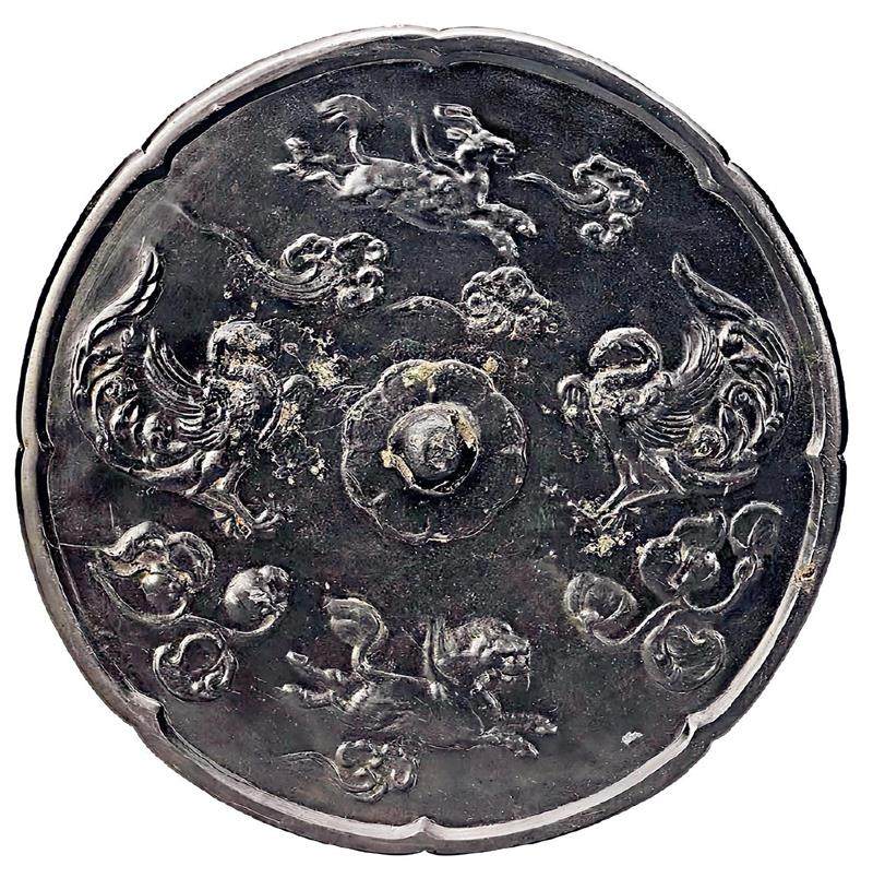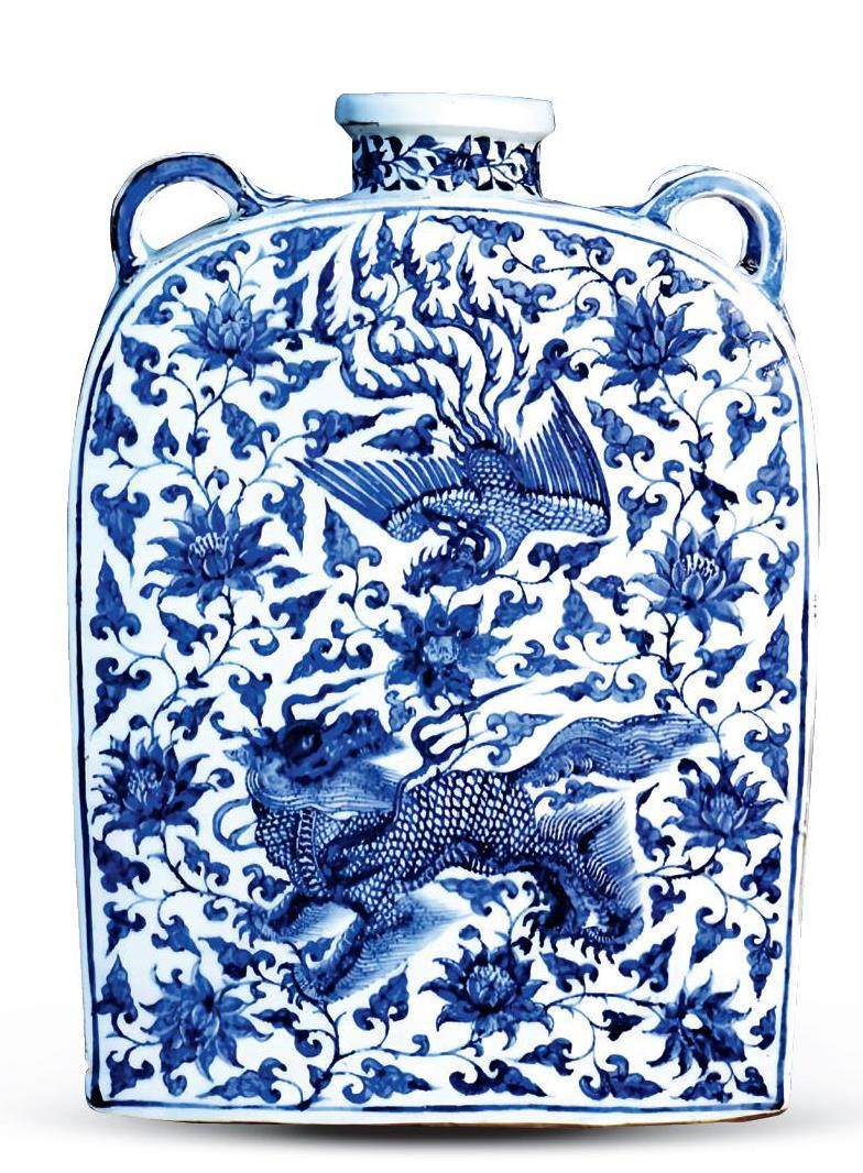 另一种则是上下搭配,其出现时间稍晚。如故宫博物院藏唐代麒麟双凤纹铜镜即是,上面双凤做舞姿,下面麒麟奔腾。上下搭配者还有一种形式,如伊朗国家博物馆藏元代青花凤凰瑞兽穿花纹四系扁方壶。图中凤凰在上俯冲而下,下面奔腾的麒麟作回首状,两者上下四目相对。这一形式在宋元及以后成为麒麟凤凰纹的主流搭配。