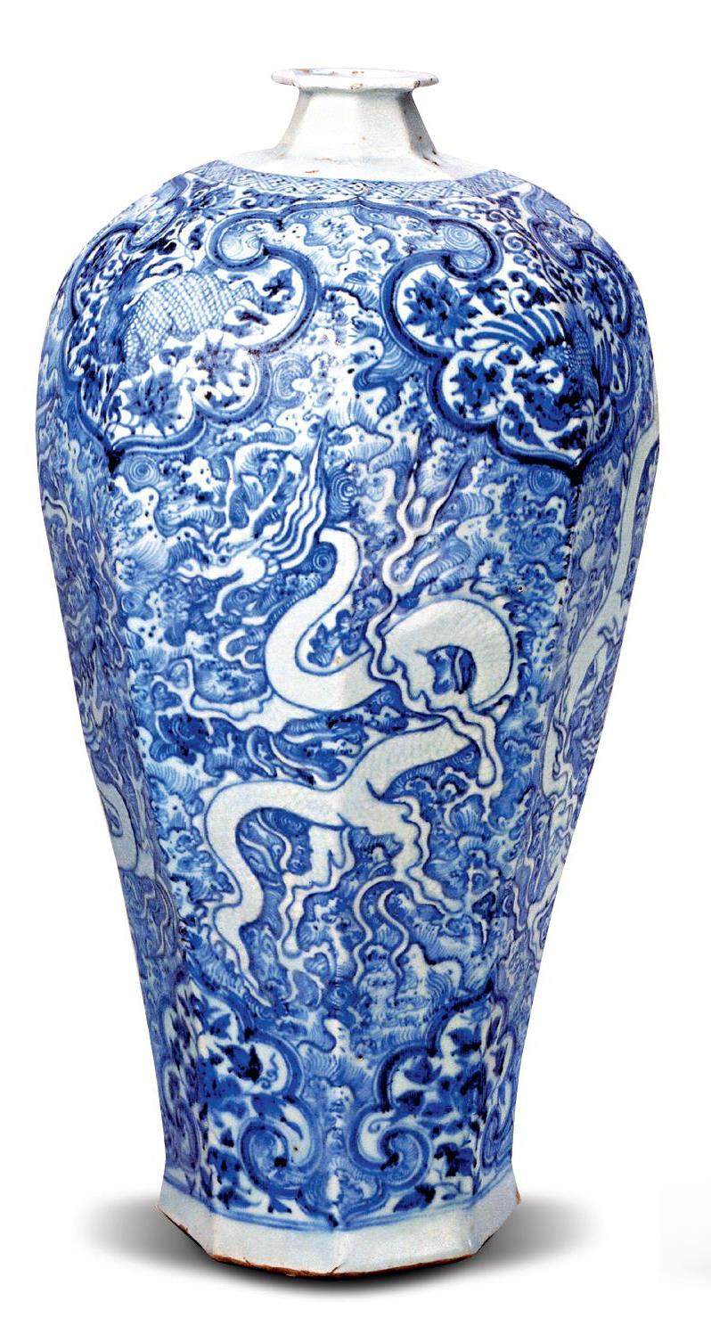麒麟凤凰纹的搭配方式大体分两种。一种为左右搭配,如上面提到的海宁长安镇出土汉代画像石上的麒麟凤凰纹即是。这种搭配方式出现时代较早,可知至少在汉代就已形成。此搭配方式到元代也有出现,如故宫博物院藏元代青花海水白龙纹八方梅瓶,在梅瓶云肩部位可以看到麒麟与凤凰分属左右,但这种搭配应该基于云肩的设计才把两者画在不同区域内。