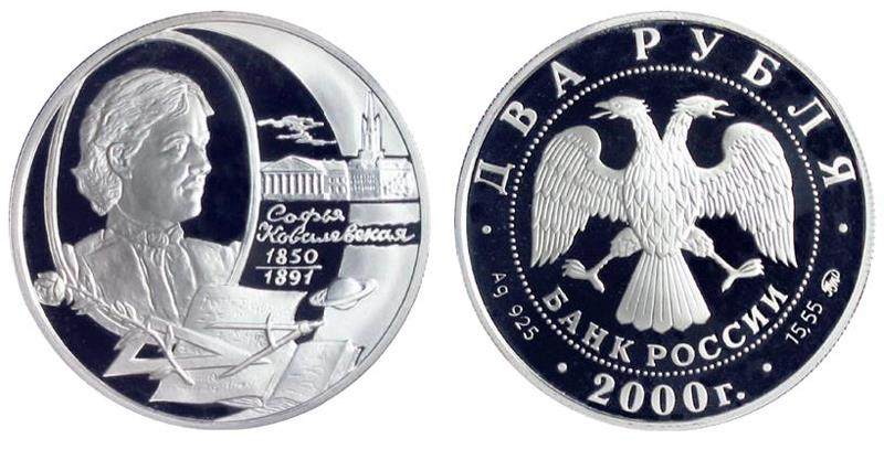 在她去世百余年后,俄罗斯于2000年发行了柯瓦列夫斯卡娅诞辰150周年纪念银币。此枚银币含银92.5%,面值2卢布,重量15.55克,直径33毫米,发行量5000枚。银币背面刊有柯瓦列夫斯卡娅的正面右侧3/4浮雕胸像,右侧刊有姓名“索菲娅·柯瓦列夫斯卡娅”,生卒年份“1850-1891”,胸像下饰有一株玫瑰花。主体胸像之下还刊有两脚规、三角板与带光环的土星,象征着她对数学与科学所做出的伟大贡献。背景刊有圣彼得堡和斯德哥尔摩的建筑物,象征着她的学术地位。