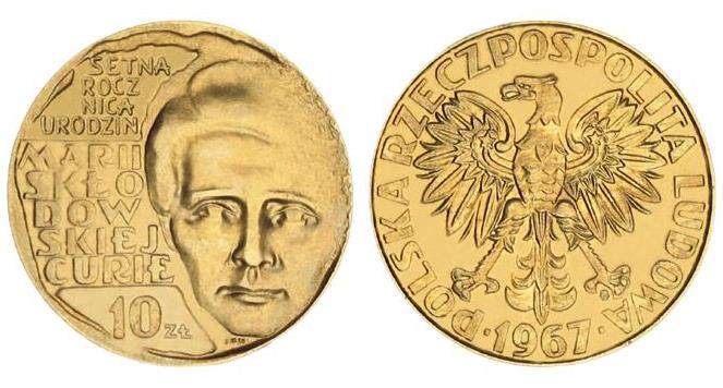 1967年,波兰发行居里夫人诞辰100周年流通纪念币。材质铜镍合金、面值10兹罗提、重量9.7克,直径28毫米,发行量200万枚,是波兰发行的最早的居里夫人纪念币。纪念币背面刊有居里夫人正面浮雕头像、左侧刊有姓名“玛丽·斯克罗多夫斯卡·居里”以及面值。直齿边,无边铭,章型。