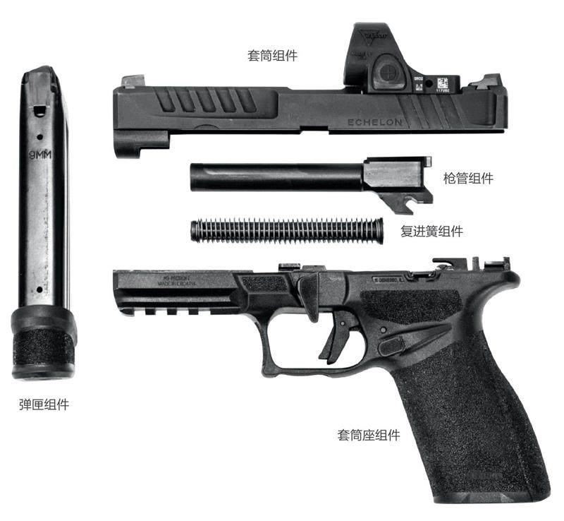 斯普林菲尔德武器公司的梯队手枪是一款采用聚合物套筒座的击针式手枪,使用9mm巴拉贝鲁姆枪弹。其总体结构与目前市面上在售的手枪基本一致,由套筒组件、套筒座组件、复进簧组件、弹匣组件以及枪管组件组成。