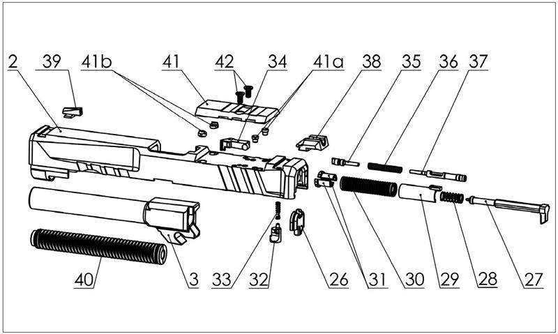 2.套筒 3.枪管 26.击针挡板 27.击针 28.击针平衡簧 29击针套管 30.击针簧 31.击针簧挡圈 32.击针保险 33.击针保险簧 34.抽壳钩 35.抽壳钩轴 36.抽壳钩簧 37.抽壳钩簧导杆 38.照门 39准星 40.复进簧组件 41.VIS盖板 41a.VIS销(用于Leupold、 Deltapoint 、Dragonfl紅点瞄准镜) 41b. VIS销(用于Trijicon RMR红点瞄准镜) 42.VIS螺销