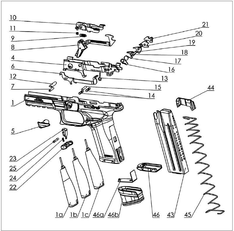 1.套筒座组块 1a.握把背板 (小) 1b.握把背板 (中) 1c.握把背板 (大) 4.发射机座 5.分解杆 6.弹匣阻挡杆 7.扳机轴 8.扳机部件 9.扳机拉杆簧 10.空仓挂机 11.空仓挂机簧 12.空仓挂机轴 13.弹匣阻挡杆簧 14. 弹匣阻挡杆簧轴 15.阻铁轴 16.安全阻铁簧 17.阻铁簧 18.阻铁 19.安全阻铁 20.阻铁解脱杆 21.击针保险杆 22.弹匣卡笋 23.弹匣扣 24.弹匣扣簧 25.弹匣扣轴 43.弹匣体(17发) 44.托弹板 45.托弹簧 46.弹匣底盖 46a.弹匣增量底板 46b.弹匣增量底盖