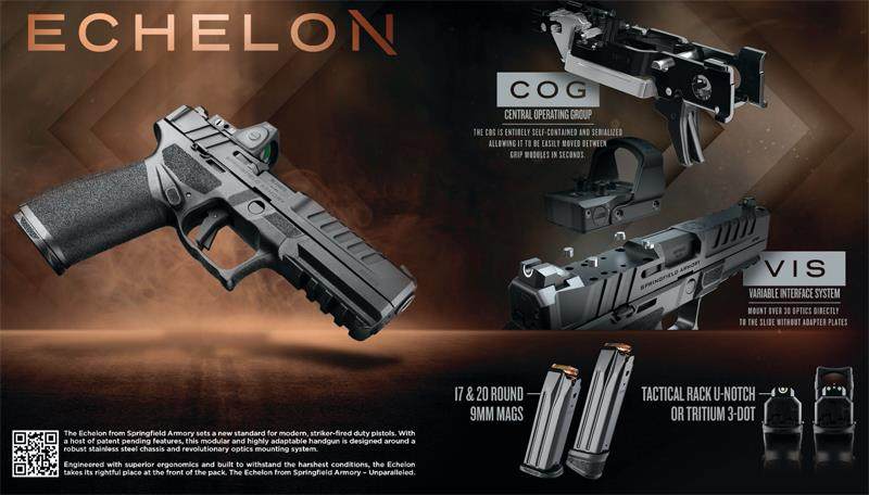 斯普林菲尔德武器公司营销副总裁史蒂夫·克莱默(Steve Kramer)表示:“梯队手枪是全新设计的,旨在成为当今最先进的击针式手枪。这款新型手枪配备了精密制造的COG(Central Operating Group,中心工作部件)、革命性的瞄准镜VIS(Variable Interface System,可变接口系统)、先进的套筒设计和增强的人体工学设计,是多年来产品研发的集大成者,旨在打造一款终极勤务和防御手枪。”