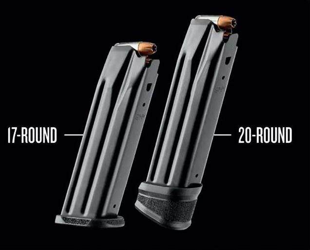 借鉴弹匣容弹量最大化方面的先进技术,梯队手枪采用了全新的弹匣, 较短的弹匣可容纳17 发枪弹。当然,它的设计旨在为执勤使用提供耐用性和可靠性,并涂有黑色防刮耐磨涂层。但最令人印象深刻的是通过更换弹匣增量底板、弹匣增量底盖,即可使弹匣容弹量增到20 发。