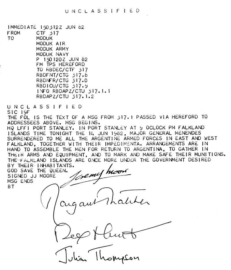 无线电山距离斯坦利外围只有大约3.2km,但英军在马岛地面战中的作战行动却最终止步于此。因为谁都没有想到,这场全世界瞩目的战争的最后一戰,居然和小孩“过家家”一样,猝不及防就结束了。英军对阿军最后一道防线的进攻开始后,阿根廷驻马岛的最高指挥官梅南德兹少将自知大势已去,便通过中间人,主动与英方接洽投降之事,而英国人从1982年6月6日开始,就一直在不断地劝降,双方一拍即合。14日下午,英军杰里米·摩尔少将乘坐“海王”直升机降落在斯坦利,与梅南德兹见面。经过一番并不激烈的讨价还价,梅南德兹于当晚21:00许在无条件投降书上签名。随后,摩尔少将模仿1945年5月蒙哥马利元帅发给丘吉尔首相电报中的措辞,向伦敦报告英军正式收复马岛。长达74天的马岛战争宣告结束。