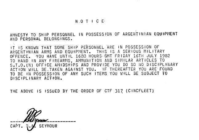 无条件投降书上写明:“……所有驻马岛阿军将前往摩尔少将所指定之地点交出他们的枪支、弹药、各种武器以及由摩尔将军或其他英国军官所指定的各种战争工具。”一时间,斯坦利街头路边到处堆满阿军交出的武器弹药和各种物资,更多重型装备被丢弃在机场或各处曾经的阵地上。考虑到它们现在都是“女王陛下的财产”,且鉴于两次大战和朝鲜战争的前车之鉴,英国国防部特意规定不允许任何参战军人将战利品私自带回,因此编制了一份非正式的战利品清单,并分门别类地进行了处置。