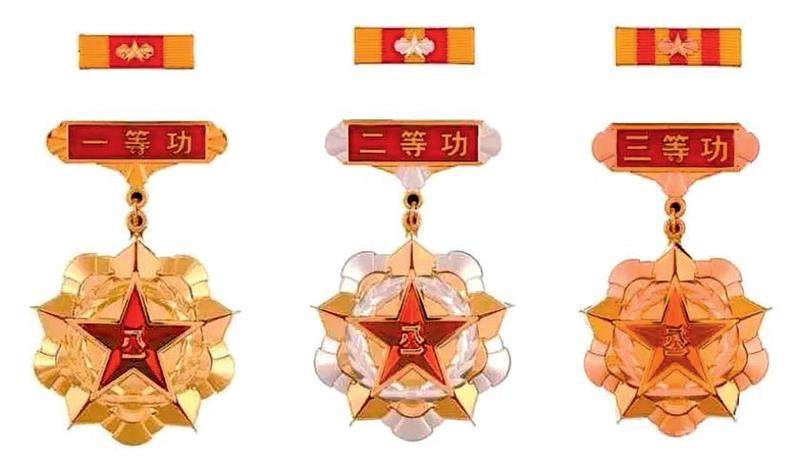 立功奖章略章由金黄色丝织带编成,以编织带上不同规格的红色竖条数量区别立功等级。一等功为1道宽竖条上钉缀镀金质五角星衬托光芒,二等功为2道中竖条上钉缀镀银质五角星衬托光芒,三等功为3道细竖条上钉缀紫铜质五角星衬托光芒。
