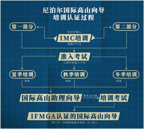 从获得认证的时间成本而言,其实并不夸张。以尼泊尔培养体系下的国际高山向导认证流程为例,从参加IMC到最终拿到国际高山向导资格认证,至少需要约4年的时间。“慢的话,在北美花七八年,甚至十多年的人都有。”周鹏说。因为各会员国都是在IFMGA的最低标准下制定本国的具体培训认证课程体系,所以耗时和课程要求并不完全一致。