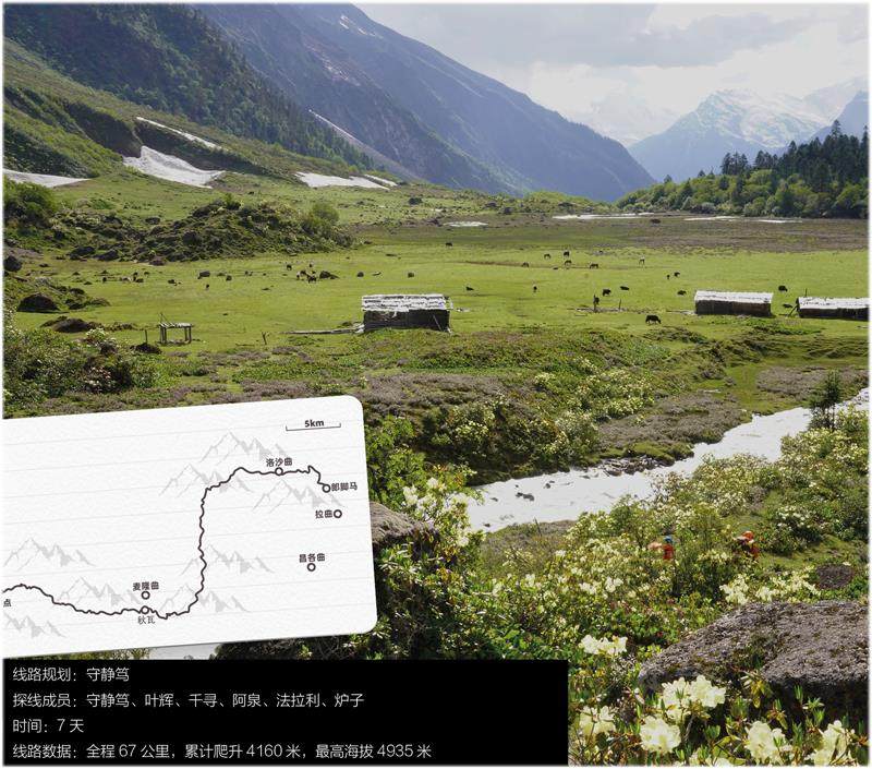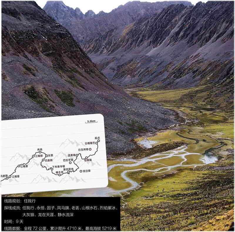 线路从西藏山南市措美县普日曲穿越到洛扎县龙拉村。起始海拔4800米,最高翻越了5750米垭口。沿途可看到十多座6000米级雪山和十多个高山海子,景色丰富多变。