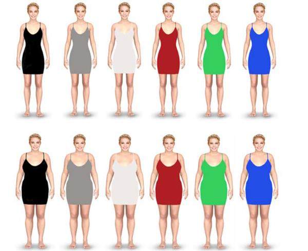 结果显示,无论是对身材纤细还是身材丰满的人来说,穿黑色、蓝色、红色衣服的体型看起来比实际体型要瘦。在这三种颜色里,“显瘦”效果又是:黑色>蓝色>红色。相比之下,灰色、绿色、白色的衣服更“显胖”。而显胖效果为:白色>灰色>绿色。