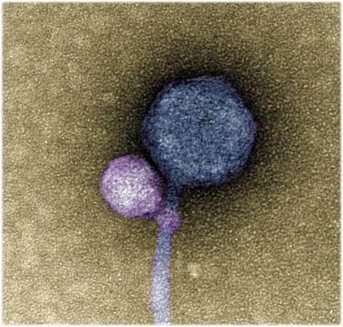 這张电子显微镜拍摄到的图像显示了两个病毒,其中紫色的小病毒伸出一个短短的“触须”,牢牢地攀附在蓝色大病毒的“脖子”上。小病毒属于卫星病毒,这类病毒是有缺陷的病毒,它们缺少指导合成衣壳(病毒“头部”)的DNA,因此卫星病毒需要利用辅助病毒合成的衣壳才能完成组装。