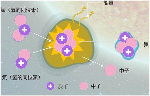在太阳核心,巨大的质量创造出极端的温度和压强环境,迫使原子核相互高速碰撞。一旦碰撞的能量突破库仑势垒,原子核融合在一起,聚变链式反应就被启动。在氢聚变成氦的过程中,会有约0.7%的质量亏损,这部分质量以能量的形式辐射出去,这部分亏损的质量就是核聚变的巨大能量来源。