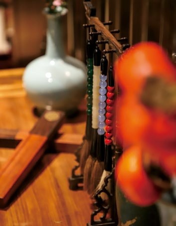 店内整体色调沉稳,用木质家具、红木屏风和古朴的灯具营造氛围。从门庭到厅堂,各种汝窑瓷器琳琅满目,文人书画比比皆是,甚至每个包间名都采撷自宋词。大厅内充满诗意的盆栽随处可见,翠竹掩映间,《念奴娇·赤壁怀古》的词句若隐若现,让人有种真的置身于宋朝的恍惚感。