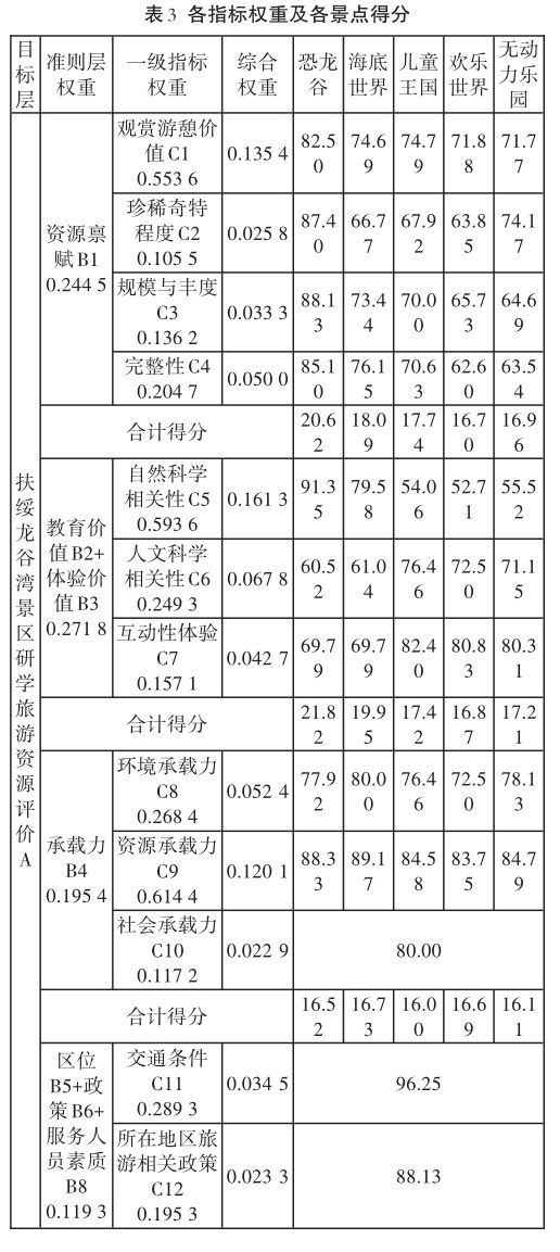 选取扶绥县龙谷湾景区恐龙谷、海底世界、儿童王国、欢乐世界及无动力乐园5个景点作为研究区域,以景点的研学性、教育性和旅游性作为研究对象,设计调查问卷,引导游客及潜在游客对景区价值进行评判,共发放问卷100份,收集有效样本96份,有效问卷回收率为96%:景区游客60份,当地高校旅游管理专业师生24份,当地居民12份。问卷采取百分制,被访者对8个维度及17个一级指标打分。