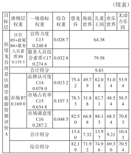 结合相关标准,采用自然断点法将龙谷湾景区研学旅游资源的研学性、教育性及旅游性的分值划分成了四个标准:分值≥90,优秀;75≤分值<90,良好;60≤分值<75,中等;分值<60,差。结果显示5个景点里恐龙谷景点得分最高为82.19分;欢乐世界景点得分最低为69.30分;只有恐龙谷景点分值落在了良好分值域里,其他景点的分值都落在了中等分值域中。