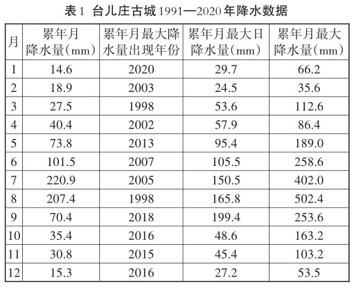根据台儿庄古城气象站提供的气象数据进行分析,将可能影响旅游产业的降水、气温、日照以及湿度等因素的主要数据汇总于表1、表2、表3、表4中。