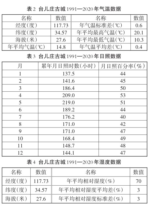 台儿庄古城地处中纬度暖温带季风型大陆性气候区,兼有南方温湿气候和北方干冷气候的特点。通过分析以上数据得出,台儿庄古城年平均气温为14.8℃,年平均降水量为856.9毫米,降水多集中在夏季,年平均日照百分率为47%。可见,台儿庄古城具有四季分明、春季温润、夏季雨量适当、秋高气爽、冬冷干燥等适宜旅游的气候特点[2]。