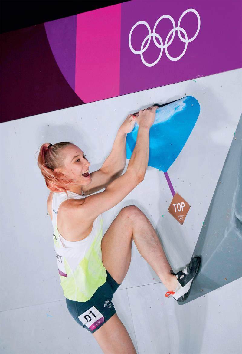 攀石赛,又称抱石赛,运动员不用绳索,每轮攀登四五条线路,在规定时间里完攀的线路数量越多,获得的得分点数量越多,尝试的次数越少,成绩就越好。这个过程不仅考验运动员的体能和灵活度,更体现其对各种难点的破解力和创造力。赛场上,运动员一个又一个在线路上频频尝试,又屡屡功亏一篑,在一片叹惜声中砰然掉落的场景比比皆是。再看加恩布雷特,在岩壁上一招一式合理到位,敏捷灵巧,化险纾难。无论线路设计得多么让人头痛,大多不能阻止她过关到顶。