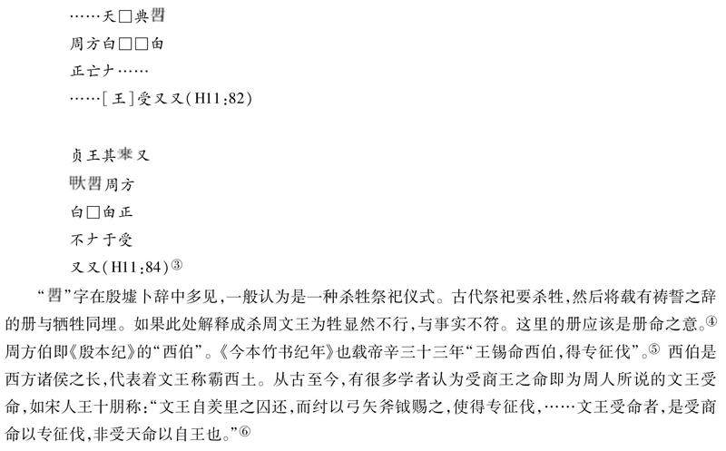 《史记·殷本纪》载文王被释之后,商纣王“赐弓矢斧钺,使得征伐,为西伯”。周原甲骨也记录了商王对文王的册封: