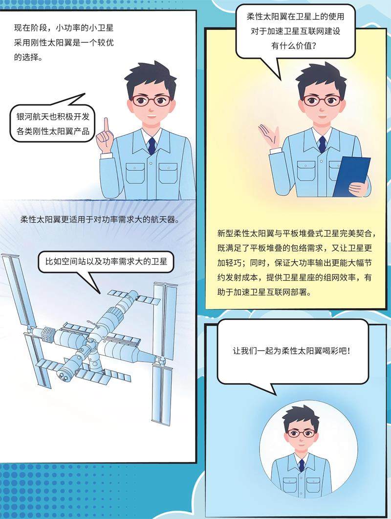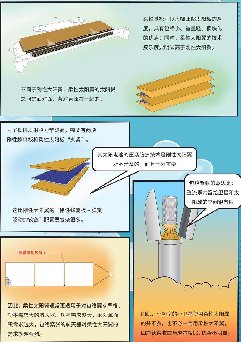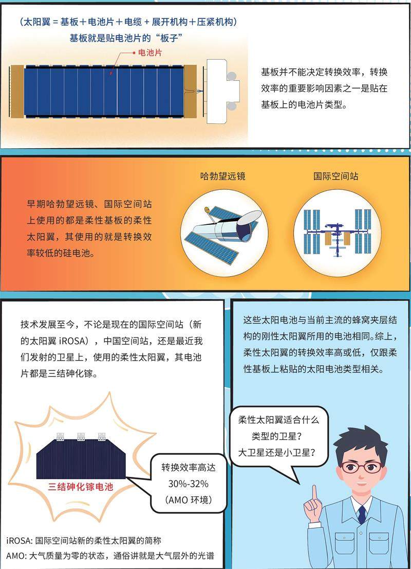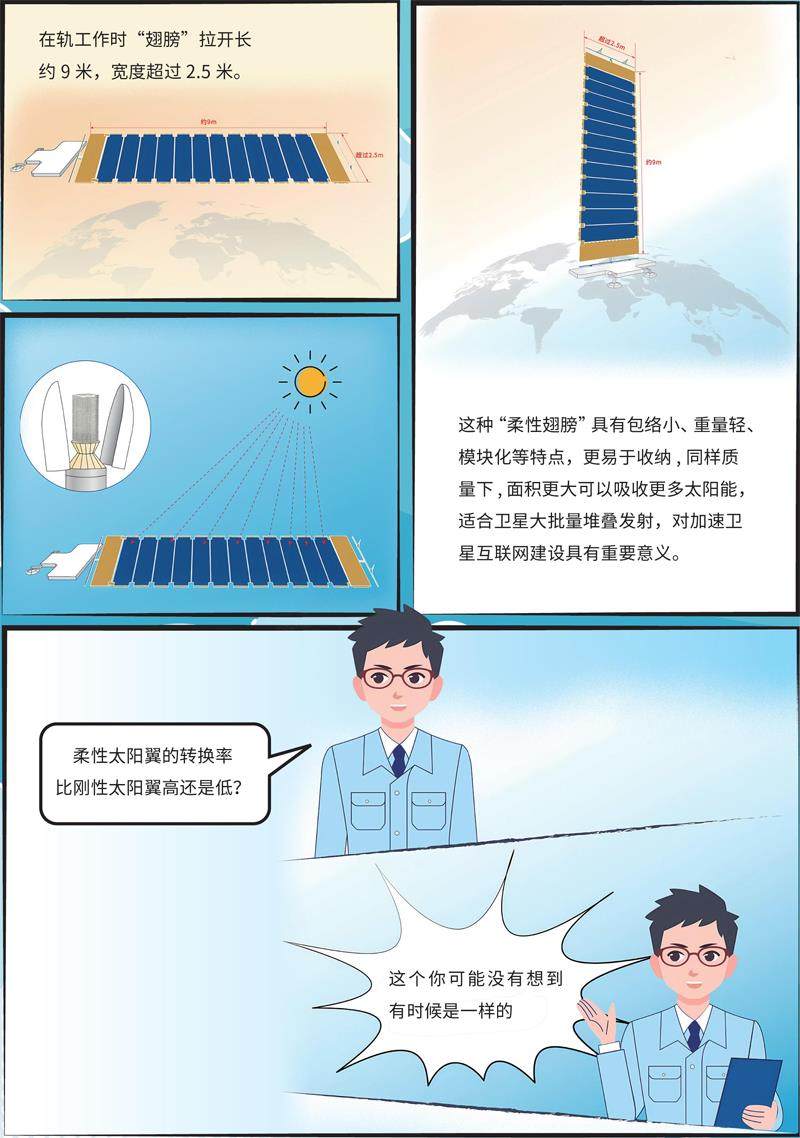 这双“柔性翅膀”非常薄,单层柔性太阳板厚度仅1 毫米左右,它可以像古代的“奏折”那样折叠,装在火箭中时为折叠状态,主体厚度不到5 厘米;在轨工作时,“翅膀”展开长度约9 米,宽度超过2.5 米。