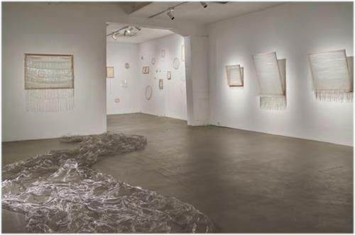 于是在我的心態摆正之后,2023年5月,我在798太和艺术空间为留日装置艺术家易雅静策划了她的个展。艺术家是我从小就认识的同学,所以她对我十分信任。而这算是一次“临危受命”,接受委托时离展览开幕只有21天,与雅静电话沟通之后,我立刻买了从上海到北京的机票。雅静为这一次展览制作的新作品是《徒劳地幻想一片荒原》及《河流似河流》,她把塑料编织袋和铁丝网抽丝剥茧地拆解,在规则的画框以及地面上形成了不规则的、肆意横流的瀑布和河水。看到她的新作品立即给了我很多灵感,“为什么你会对与水相关的意向感兴趣?”“为什么你喜欢用这些劳动场景中最廉价的材料?”在这些问题的帮助下,雅静重新反思了自己的创作灵感和思路,而她的追本溯源也帮助了我去构建整个展览的陈设和动线。我把展览分成五个区域,一个区域就像一座花园,这个作品叫做《花园一隅暂时没有生物》,是艺术家用水管、塑料网和树脂等组合而成的实验性装置,平时放在她的工作室最显眼的地方,我把它放在展厅一进门的一块单独的空间里,将装置散落至墙面各处,构成一个墙上的花园;第二个区域是最主要的作品《徒劳地幻想一片荒原》,它布满展厅的各处,从一进门看到的主视觉墙面,到大展厅的左右两个墙面,最大的一幅是在展厅的里面从天花板延伸到地面的一个巨型“瀑布”装置,从最小到最大的尺幅见证艺术家不断地突破画框的束缚的过程,我也建议雅静把垂直悬挂画框变成倾斜悬挂,这样“水流”的倾泻感会更明显,更灵动;第三个区域是与瀑布遥相呼应的《河流似河流》,是一条躺在地面的铁丝河流,这是出于一种展厅空间的制衡;第四个区域是《凝视》,由几张复合材料作品加上一个视频组成,这个部分是展厅的暗区;第五个部分在展厅的最里面,被“瀑布”装置隔开的一个半独立的空间,刚好也可以防止观众踩踏。