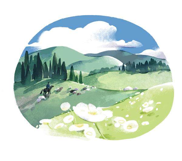 在牧场开车兜风的乐趣之一,就是几乎没什么车和你的车抢道。偶尔会有一辆移动卖货车,或者拉满牛粪、干草的拖拉机。要是有小汽车从这些蜿蜒曲折的狭窄村道上驶过,尤其是车身没有灰尘泥土的,一看就是从城里来的,那简直稀奇得不得了,足以引得斜靠在山坡上的牧羊人坐起身来端详一番。他们活动一下压酸了的手臂,在阳光下眯起眼,盯着汽车,直到汽车驶远,消失不见,这才吐一口气,把自己再次扔回草地的怀抱中。