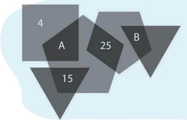 一名制陶工人制作了一些幾何形状的餐盘——三角形、正方形和五边形,并创作了这道图形题来推广这些盘子。你能解答这道题吗?请根据图中数字背后的逻辑,计算出A+B的总和。(答案见下期)