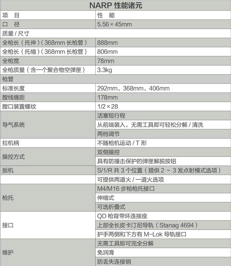 虽然NARP包含一些让人联想到AR 15步枪的元素,但它无疑是一个创新平台,拥有许多新专利(尚未有详细资料披露)。除手动保险外,该步枪还设置不到位保险,这意味着除非枪机框完全复进到位,否则步枪无法射击。此外,NARP还具有防跌落的安全装置,可防止意外开火。