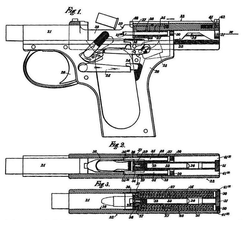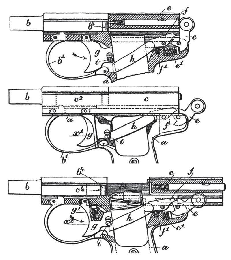 2个专利之一的1908-23200号专利,主要是关于新设计的扳机、阻铁以及连接二者的扳机连杆部分。当击锤未压下时,扳机连杆保持在较低位置,无法接触扳机后部,不能与扳机连接。当击锤压下时,扳机连杆向上抬起,直接抵住扳机左后侧位置,与扳机形成连接。当扣动扳机时,该部分向后推动扳机连杆并释放击锤,在此过程中扳机向上移动,与扳机连杆断开连接。击锤释放后,扳机连杆又向下移动。当套筒后坐将击锤压下时,扳机连杆再次抬起,但在松开扳机之前,扳机无法与扳机连杆重新连接。