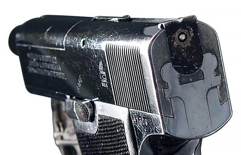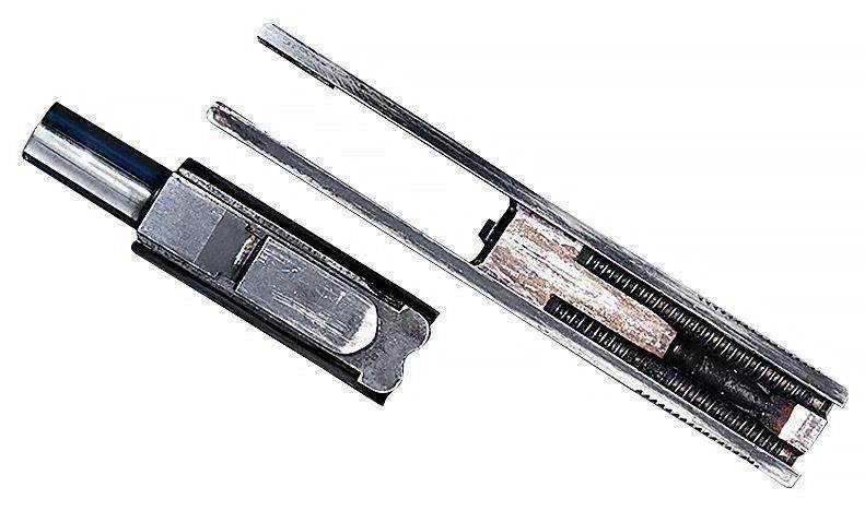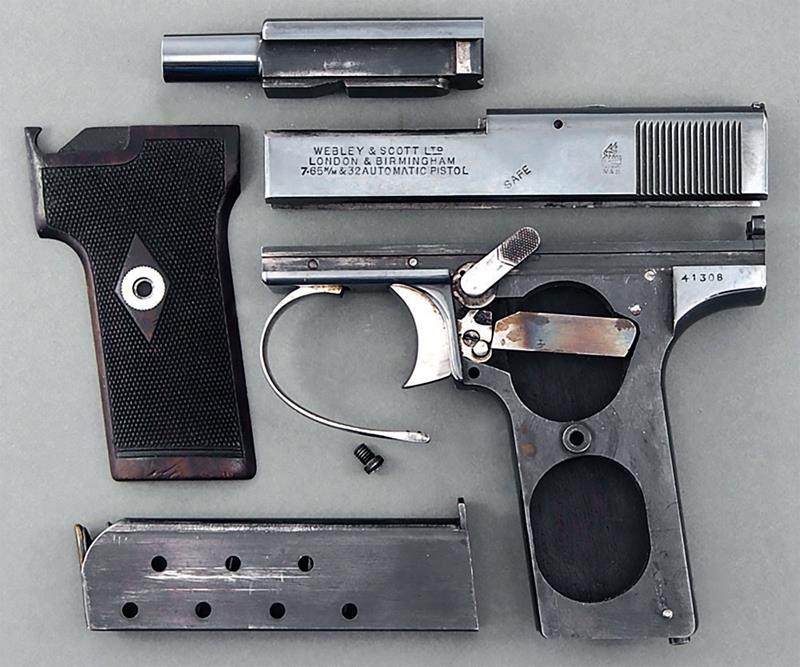 怀廷的这一设计在外形上很像此前推出的韦伯利- 斯科特6.35mmM1907自动手枪,两者都有外露的击锤。但实际上两枪的差别也十分明显,最典型的是新枪套筒采用顶部敞开式设计,但又不同于同类其他手枪,套筒前上方没有横梁来连接套筒左右向前延伸的部分,而且两侧延伸部分厚度较大,以防止变形。这样的好处是不需像M1907套筒那样专门加工抛壳窗,套筒开始后坐时,与枪管后端之间自然形成了一个空当,弹壳就从中向上抛出。此外,新设计的复进簧为平行的左右2 根,位于套筒后端上方加工出的复进簧室内,带有各自的复进簧导杆,导杆头从枪机前端面的小孔内伸出,兼作抛壳挺。带销子的抽壳钩则位于枪机前端面顶部,兼作膛内有弹指示器,枪弹上膛后,其销子顶端会从套筒顶部的小孔伸出,起到提示作用。