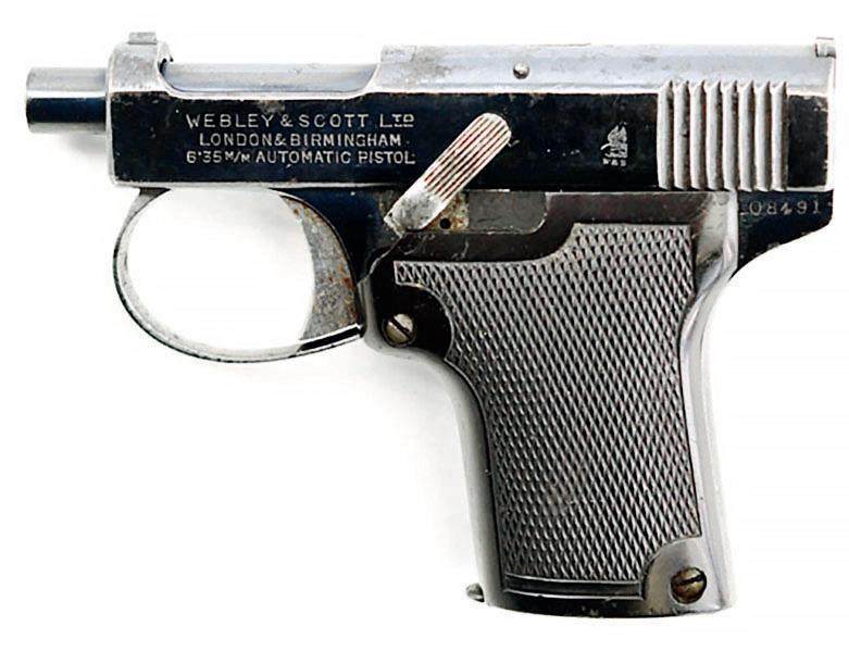 同时,怀廷也在不断改进他的设计。此后各版方案的最大变化就是取消了外露式击锤,改为内藏式,这样枪身外部的轮廓更加光滑,防止击锤在使用者拔枪时钩挂衣物而影响速度,事实上流行的各种自卫手枪包括转轮手枪都会采用类似设计。在1910-20367号英国专利(该设计未申请美国专利)中,示意图中新枪的外形已经与后来的韦伯利-斯科特6.35mm M1912“无锤”袖珍手枪非常相似。在这一专利中,套筒后端增加了底板这个零件,底板的上缘加工有缺口,可兼作照门。
