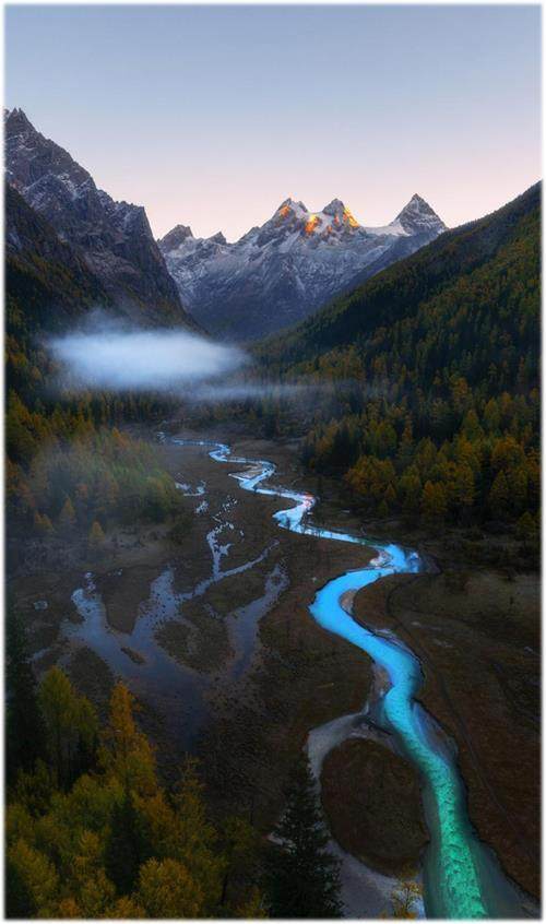 四川四姑娘山秋天的雪山河流,美得令人窒息。日出时分,巍峨的雪山在阳光的照耀下,被染成金色。山脚下的河流,清澈见底,波光粼粼,蜿蜒延伸到雪山脚下。峡谷中的彩林初黄,与雪山河流交相辉映,构成一幅绝美的秋日画卷。四姑娘山的秋天,是大自然的鬼斧神工,是雪山河流和森林的舞蹈。