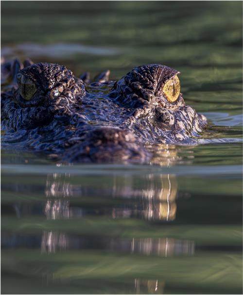 摄影师胡子捷森拍摄过很多次鳄鱼,但是在冲锋舟上以一个几乎平视的视角拍摄,这应该是第一次。HunterRiver宁静的水面映射出红树林的倒影,而在这宁静之下,却有着一双眼睛在默默地注视着我们。这双巨大的眼睛犹如水晶般透彻,环顾着四周。拍摄使用的EOSR5相机,其出色的对焦性能,在低反差下依然为摄影师牢牢锁定被摄物的眼部焦点,成就一张传神之作。