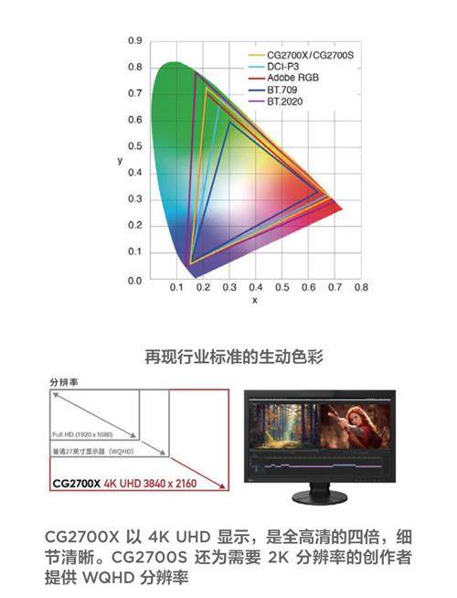 艺卓ColorEdgeCG2700X使用了高端显示器标配的IPS面板,尺寸为26.9英寸,拥有98%的DCI-P3标准,支持广播中使用的BT.2020标准。这项参数在电视台视频制作中都属于专业级别,它还覆盖了99%的AdobeRGB色彩空间。CG2700X具备16位LUT的10位同步显示功能,这个参数意味了显示器不仅“博学”,还很“专项”,它确保了显示器可以显示10.7亿色,还确保了各种设置下颜色的准确性,做到真正的“所见即所得”。