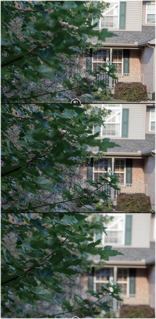 图1对焦远处房子,图2对焦中间树叶,图3对焦最近处树叶。