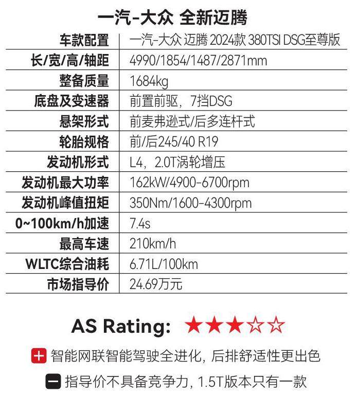 不过我们拿到的380TSI顶配用的依旧是2.0T高功率发动机,配7挡湿式双离合。162kW的最大功率和350Nm的峰值扭矩,不少人都会背了吧。破百加速时间7.4s,WLTC百公里综合油耗6.71L。