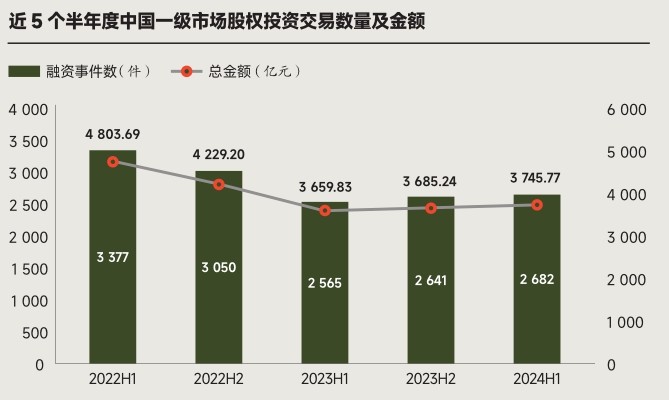 数据显示,2024 年上半年,国内一级市场私募股权融资事件数有 2 682 起,环比增长 1.56%,同比增长 4.56%;估算总投资额约为 3 745.77 亿元,环比增长1.64%,同比增长 2.35%。