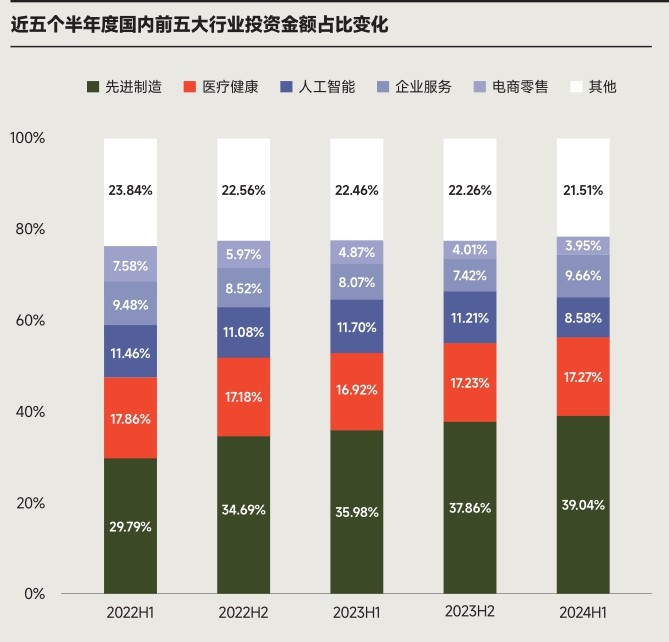 2024 年上半年,先进制造行业是连续5 个半年度最热门的投资行业(按融资总额),占比进一步提升为 39.04%;涉及集成电路、新能源、新材料等诸多领域。