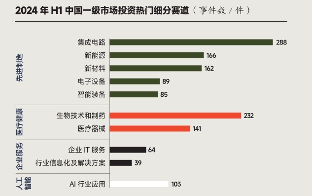 2024 年上半年中国一级市场投资最活跃的细分赛道包括集成电路、生物技术和制药、新能源、新材料以及医疗器械等领域。
