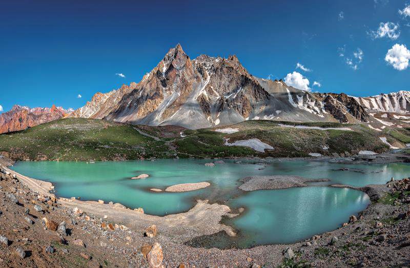 这是独库公路沿线上的一个高山堰塞湖,位于天瀑和哈希勒根达坂之间,湖水呈淡淡的绿色,被天山山脉半环绕,犹如仙境一般。